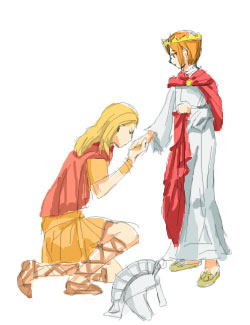 「不思議の国のアリス」の中で、チェシャ猫に向かってハートの王さまが「こちらに来て手にキスするのを許そうぞ」と尊大な言い方する場面が出てくるし、「ニュルンベルクのストーブ」に登場する王様も、ひょんなことから王の御前に転がり出る羽目になった田舎少年君に手を差し出す場面があるし、王様がいたらおててにキスは基本ですかのぅ…(エ∀エ)デヘヘ