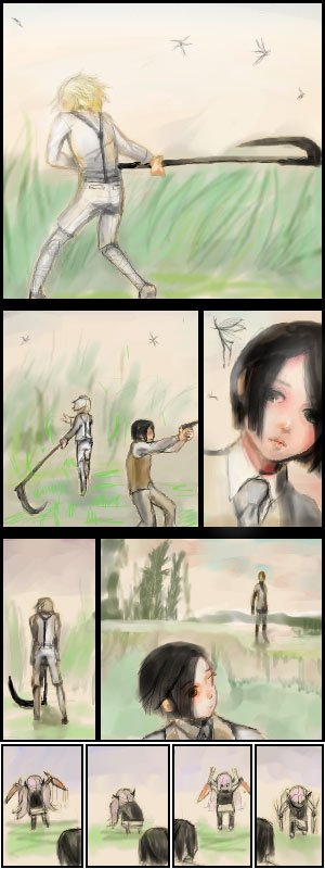 苦々しそうに、彼にではなく僕に向かって念を押す。手伝ってませんよ、僕はやんわり返して銃をホルスターに収める。彼は自分の先輩を振り向きもせず、淡々と大鎌を振るっている。命令には従うが、敬ってはいない。ありありと態度に表れている。
