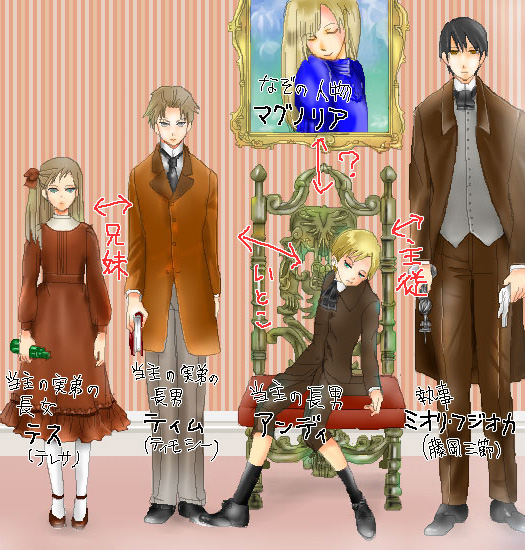 名前を出さなくてもすむ場合は出さない主義なのですが、そろそろ「坊ちゃま、執事、いとこ兄、いとこ妹」と呼ぶのにも限界を感じます。