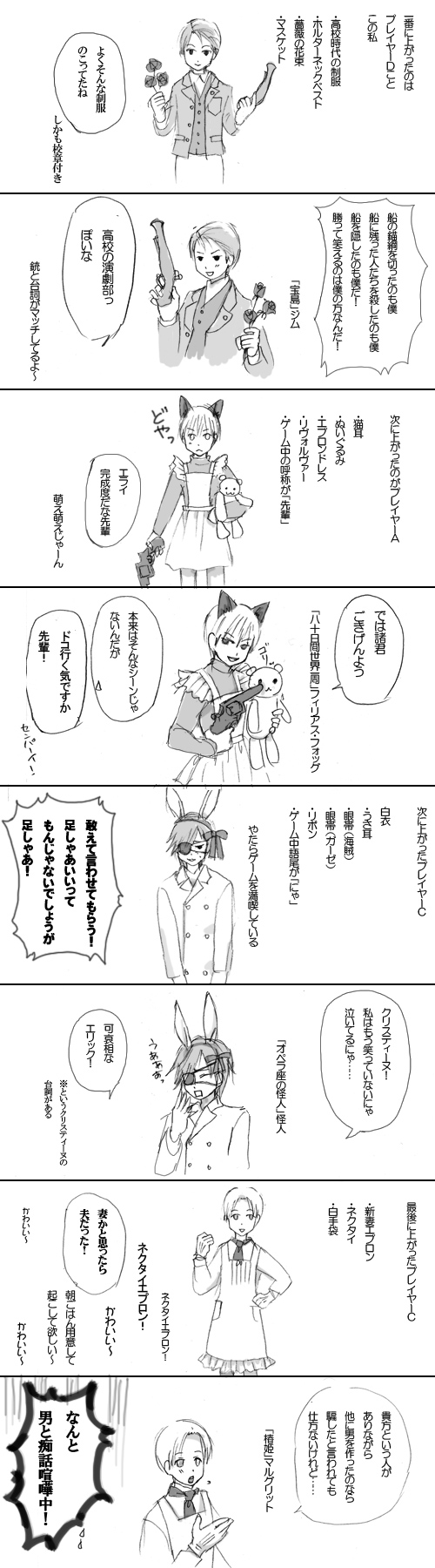 一度、猫耳+ミニクラウン+新妻エプロン+エプロンドレス+高校の制服+白衣+薔薇の花束という結果になって、着こみ過ぎて暑かったです。みちみちしてました。