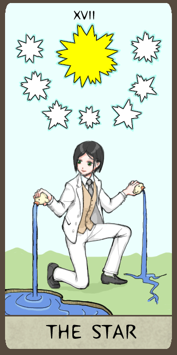 というワケで、ハングドマンと比べるとちょっとのんびりした絵面になりましたけど、星です。進が手にしているのは暇さん宅のくしかつさんではなく(@@;)、寮の部屋に置いてある進の私物のティッシュボックスカバーが元ネタでした。