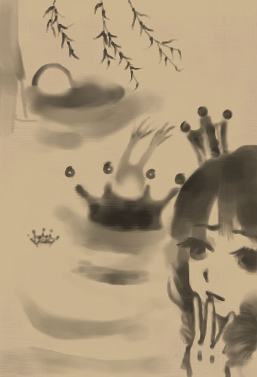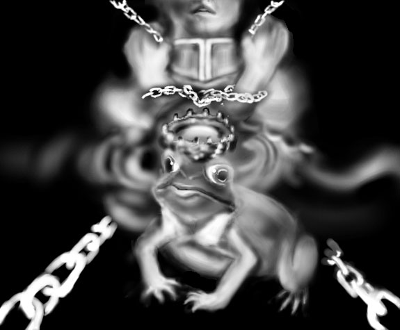 水クラウンを描きたくて、何かネタは無いかな―と思っていたところ、ちょうどその下に水生動物がいたら面白いだろうと思い付いて、「かえるの王さま、あるいは鉄のハインリッヒ」です^^b