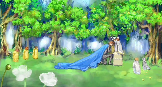 絵の中の青いマントの彼は、森に住む半獣人に気に入られて王さまになってしまいましたとさ。めでたし、めでたし。