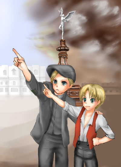 その1【「ふらんだーすのわんこ」のラストシーンのように、貧しくあらゆるものから見捨てられたようなふたりが、神々しいものを見上げながら手を取り合ってる】 その2【今期のキャラをさりげなく全て入れ込む。構図は貧民街の地べたから裕福層住宅街へのアオリ、兄弟は背中を向けている、貧民街の壁にはWANTED(ボーシ屋)、ネズミ、広場には裕福層の子供(アリス)、像は聖母子】