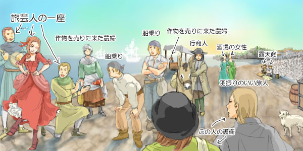 賑やかな港町の雰囲気を出したくて、商人達やら船乗りやら羽振りのよさそうな旅人やら酒場の女性やら、色んな立場の人をいっぱい描いてみました。